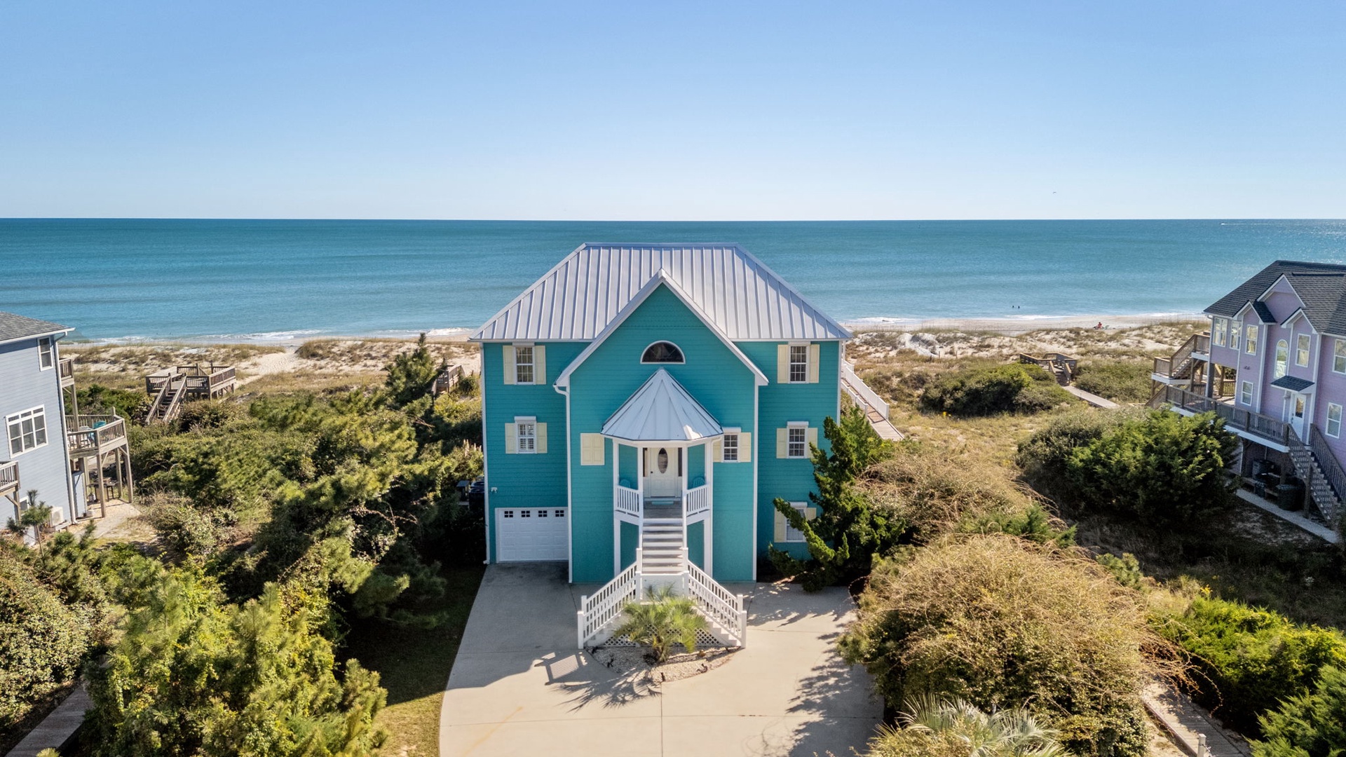This stunning direct oceanfront retreat boasts a gourmet kitchen, a game room, and abundant sleeping accommodations across three spacious levels.