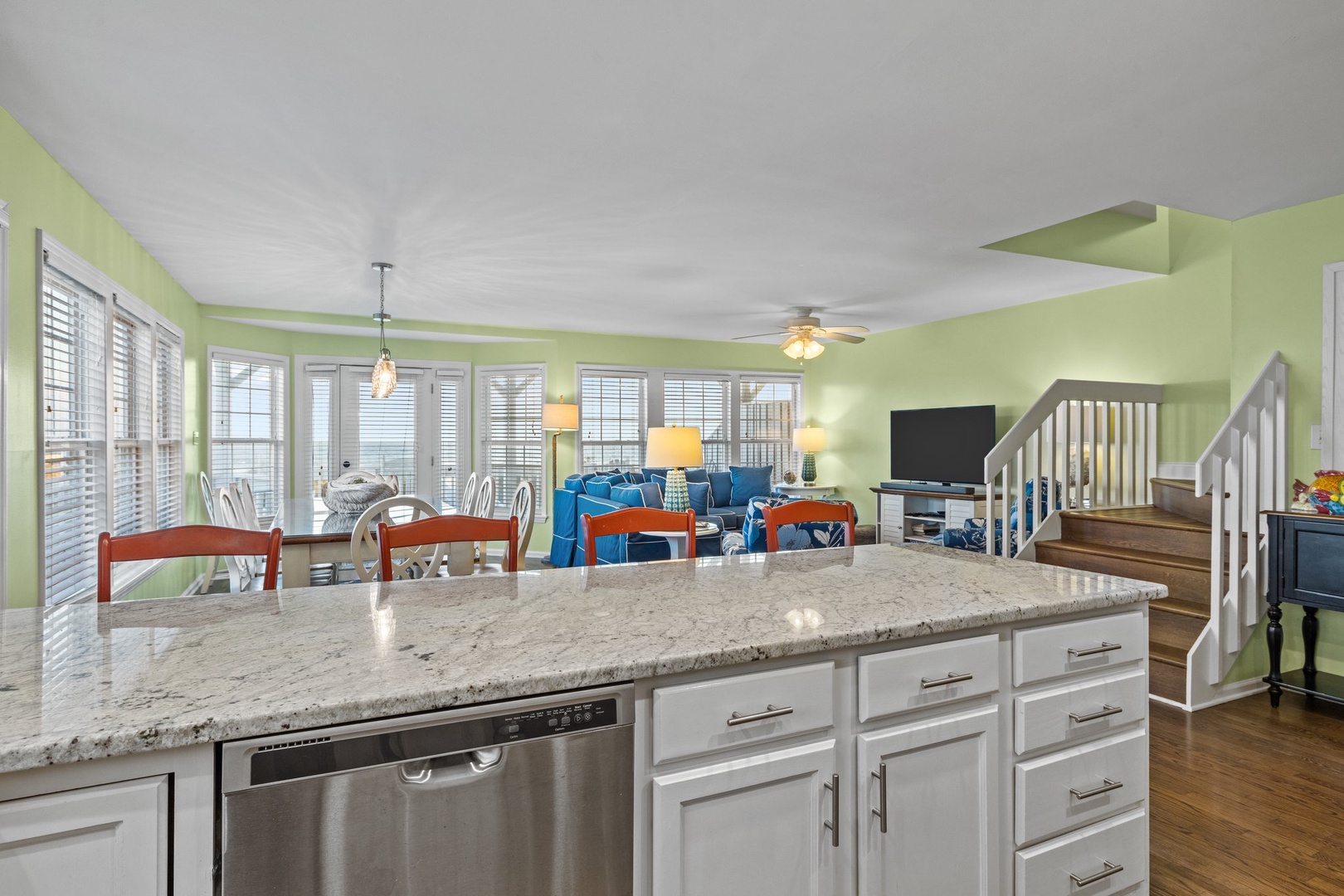 The next level offers 3 guest rooms with 2 full bathrooms. Two of these guest rooms are oceanfront; one is the Primary Suite complete with a King bed and private bath while the other Queen guest room shares the hall bath. The additional bedroom offers 2 comfortable twin beds with easy access to the hall bath. As part of the Spinnaker’s Fresh Bed Promise, all bed linens are laundered in between guests.
