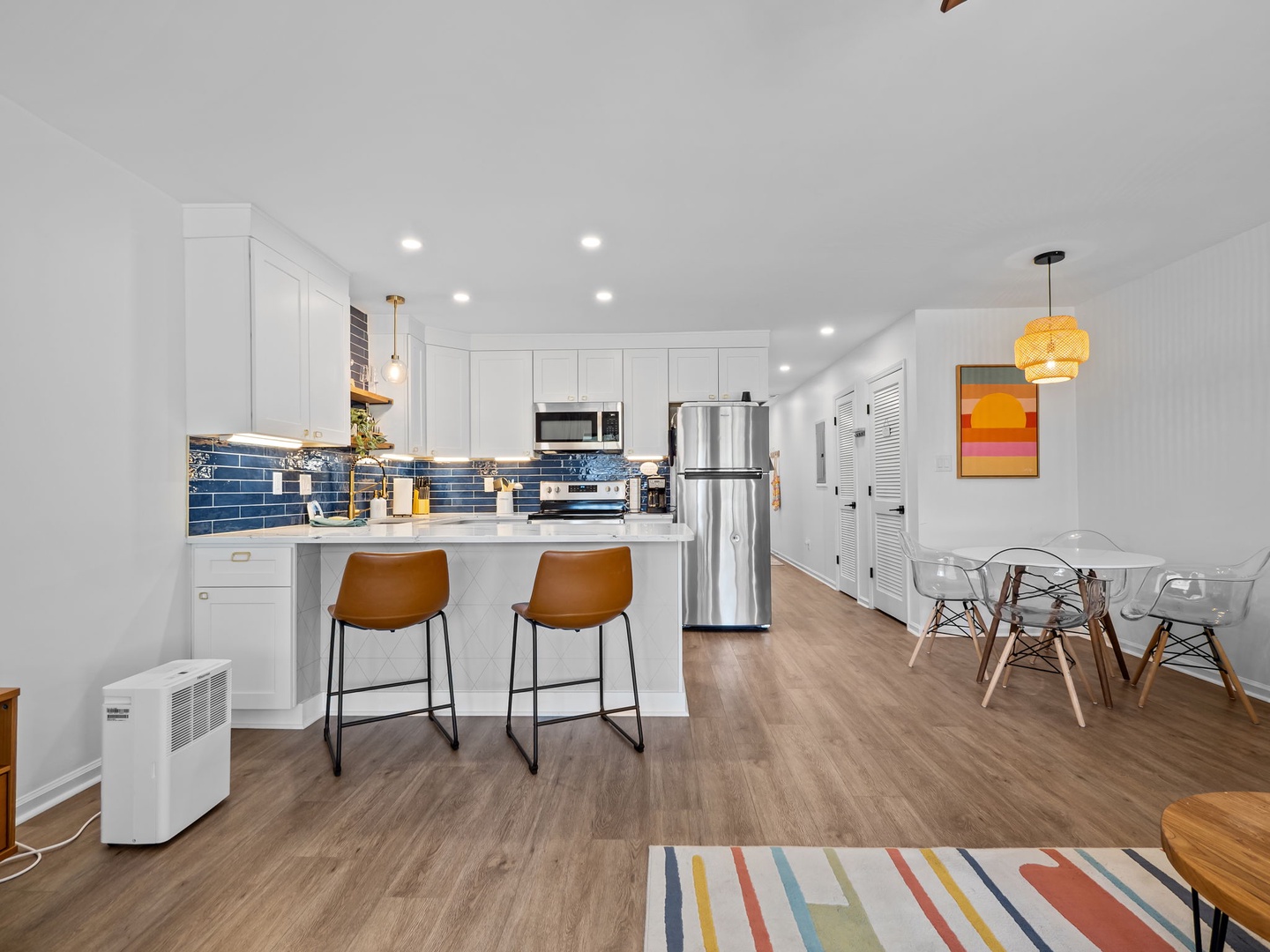 This beautifully renovated first-floor King condo offers the perfect blend of comfort, convenience, and coastal charm—just steps from the beach. Inside, enjoy a bright and open living space featuring a 55" smart TV and a plush sectional that easily converts into a queen memory foam sleeper sofa with premium linens. The fully equipped kitchen has everything you need to prepare home-cooked meals or your favorite tropical drinks, from quality cookware to a blender and coffee maker. The spacious King bedroom includes a 43" TV, built-in closet storage, and cozy bedding to ensure a restful night’s sleep. The modern bathroom features a large tiled shower with frosted glass, a generous vanity, and soft towels for your stay.