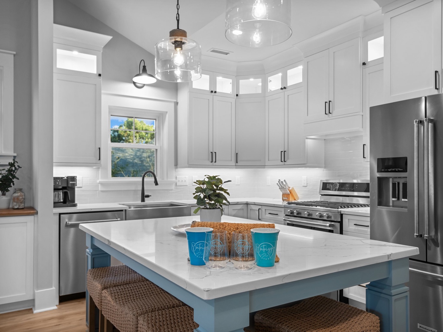 The ground floor is perfect for kids and fun-seekers alike. A bunk room features two sets of triple bunks (six twin beds total) and an attached full bathroom accessible from both the room and the hallway. The game room is packed with entertainment, including a shuffleboard table, foosball table, and Pac-Man arcade machine. The game room also boasts its own kitchen with a full-size fridge, microwave, and stove. A sliding window from the kitchen opens to the pool area, complete with an outdoor bar, making it easy to serve up refreshments while enjoying the pool’s tanning ledge.