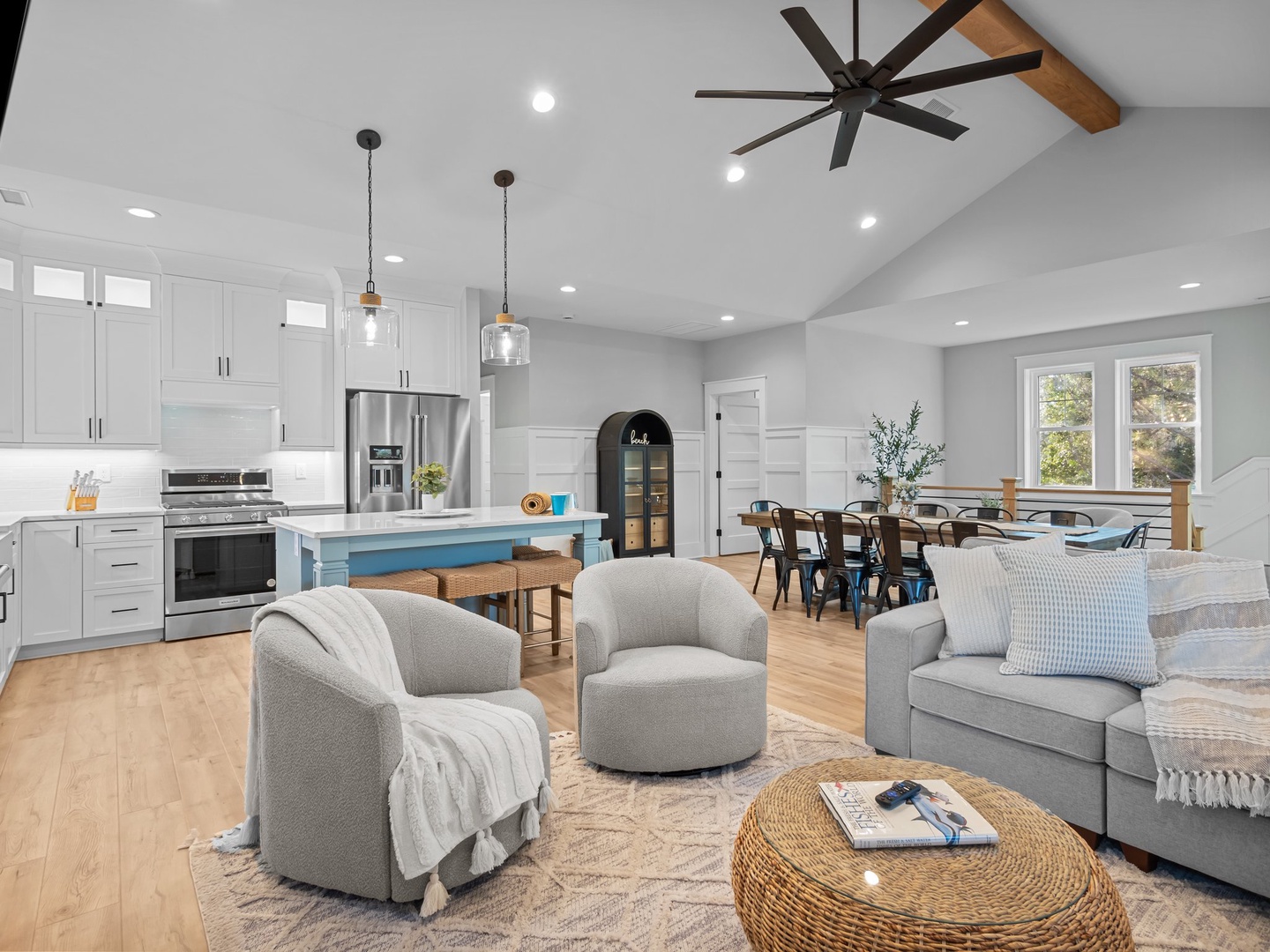 The top floor combines living, dining, and kitchen spaces with beautiful natural light and coastal views. The well-equipped kitchen and large dining area are perfect for family gatherings. The king bedroom on this level has a full bathroom across the hall, shared with the upstairs common areas. A screened porch on this floor offers a dining table and seating area, making it ideal for meals or relaxing after a day at the beach.